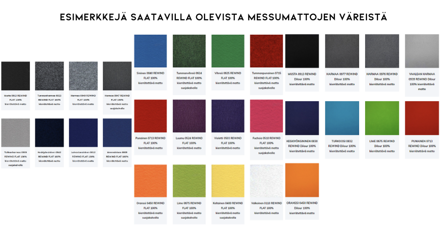Tarjoamamme perusmessumatto (10€/m2) on tummanharmaa; Rewind Flat charcoal. Mattoa on lisäksi tarjolla laajalla värikirjolla, sekä erityisillä kuvioinneilla, kysy myynnistä lisää! Erikoisvärisistä matoista tulee aina tarkistaa saatavuus.